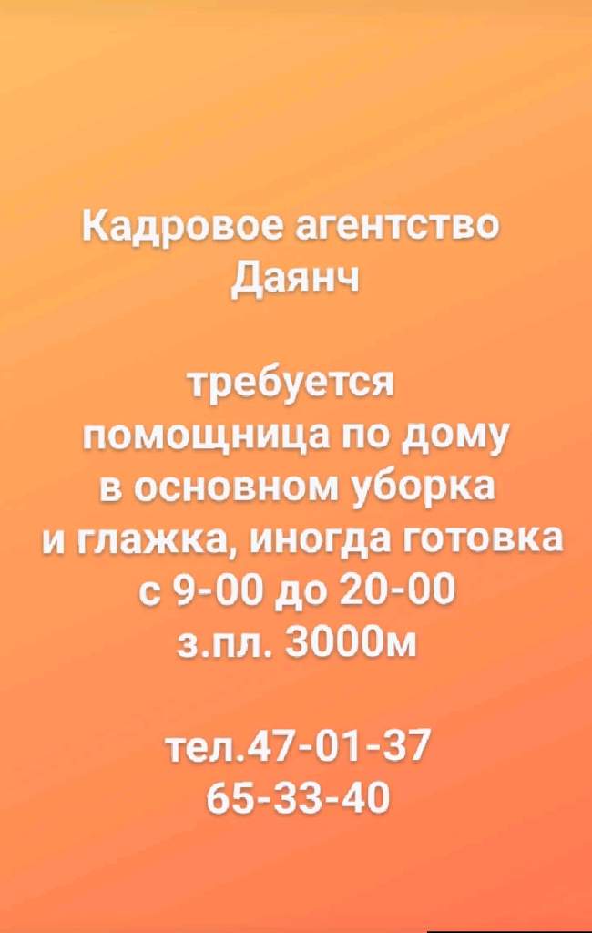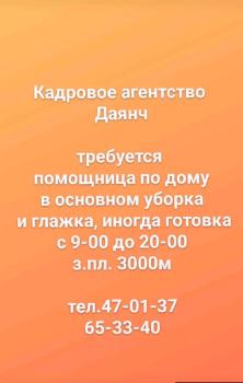Кадровое агентство Даянч требуется помощница по дому в основном уборка и глажка, иногда готовка с 9-00 до 20-00 з.пл. 3000м тел.47-01-37 65-33-40