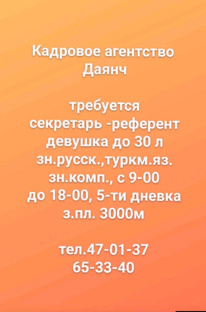 Кадровое агентство Даянч требуется секретарь -референт девушка до 30 л зн.русск.,туркм.яз. зн.комп., с 9-00 до 18-00, 5-ти дневка з.пл. 3000м тел.47-01-37 65-33-40