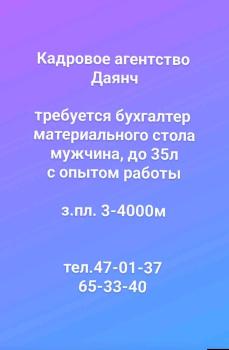 Кадровое агентство Даянч требуется бухгалтер материального стола мужчина, до 35л с опытом работы з.пл. 3-4000м
