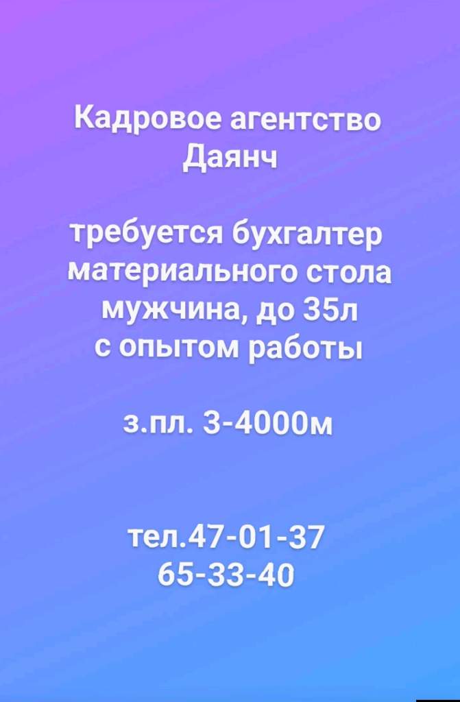 Кадровое агентство Даянч требуется бухгалтер материального стола мужчина, до 35л с опытом работы з.пл. 3-4000м тел.47-01-37 65-33-40