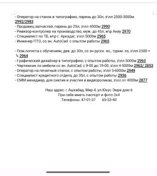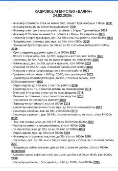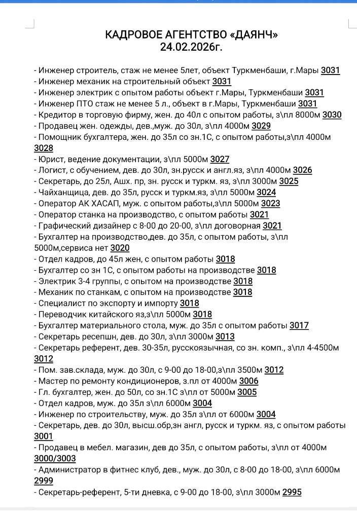 КАДРОВОЕ АГЕНТСТВО «ДАЯНЧ» 24.02.2026г. - Инженер строитель, стаж не менее 5лет, объект Туркменбаши, г.Мары 3031 - Инженер механик на строительный объект 3031 - Инженер электрик с опытом работы объект г.Мары, Туркменбаши 3031 - Инженер ПТО стаж не менее 5 л., объект в г.Мары, Туркменбаши 3031 - Кредитор в торговую фирму, жен. до 40л с опытом работы, з\пл 8000м 3030 - Продавец жен. одежды, дев.,муж. до 30л, з\пл 4000м 3029 - Помощник бухгалтера, жен. до 35л со зн.1С, с опытом работы,з\пл 4000м 3028 - Юрист, ведение документации, з\пл 5000м 3027 - Логист, с обучением, дев. до 30л, зн.русск и англ.яз, з\пл 4000м 3026 - Секретарь, до 25л, Ашх. пр, зн. русск и туркм. яз, з\пл 3000м 3025 - Чайханщица, дев. до 35л, русск и туркм.яз, з\пл 5000м 3024 - Оператор АК ХАСАП, муж. с опытом работы,з\пл 5000м 3023 - Оператор станка на производство, с опытом работы 3021 - Графический дизайнер с 8-00 до 20-00, з\пл договорная 3021 - Бухгалтер на производство,дев. до 35л, с опытом работы, з\пл 5000м,се
