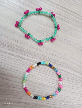 Браслет с вишенками-из бусин очень красиво смотрится на руке для взрослых и детей. Браслет с разноцветными бусинками - это универсальный аксессуар, для девушек, очень милый и красивый, и все цвета бусин сочетаются. Чёрно-белый браслет - это классическое сочетание которое символизирует гармонию противоположностей, баланс (инь и Ян). Благодаря своей нейтральности он подходит к любому гардеробу. Браслет бело-голубой с голубыми бабочками - в этом браслете подобраны красивые и нежные цвета. Если вы купите все эти четыре браслета то пятый браслет получите в подарок. Самое последнее фото браслета в подарок.
