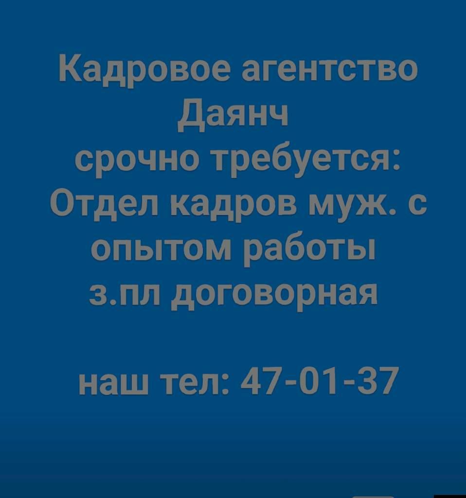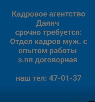 Кадровое агентство Даянч срочно требуется: Отдел кадров муж. с опытом работы з.пл договорная наш тел: 47-01-37